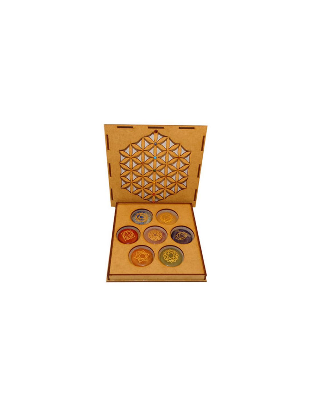 NestinarEstuche de Madera con Siete Gemas para Chakras Flor de la Vida.