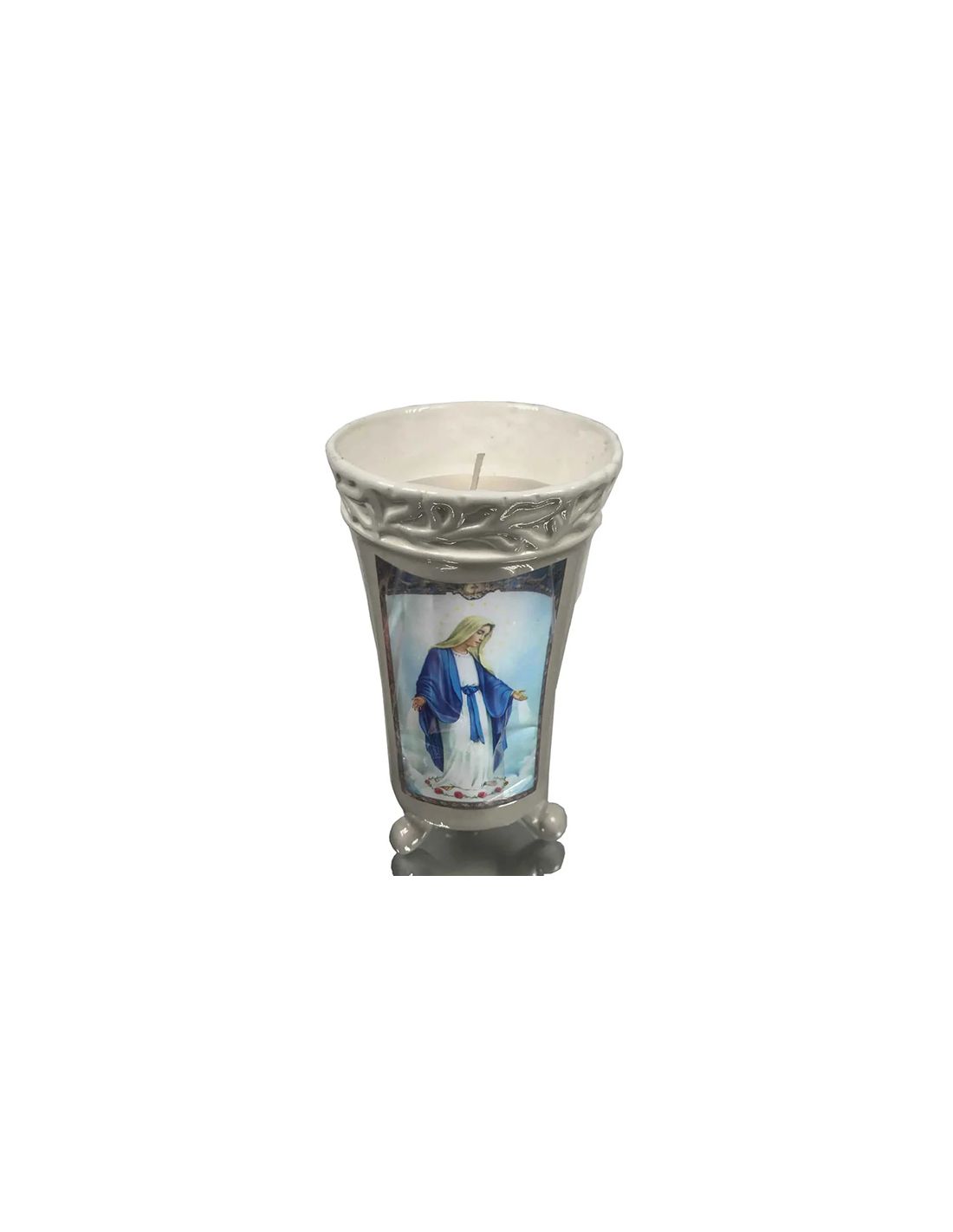 Vela religiosa, para ofrenda a la Virgen de Lourdes. No contiene aroma. Presentada en tarro cerámico de carácter clásico. Reposa sobre tres pies. Duración aproximada de 40 horas.